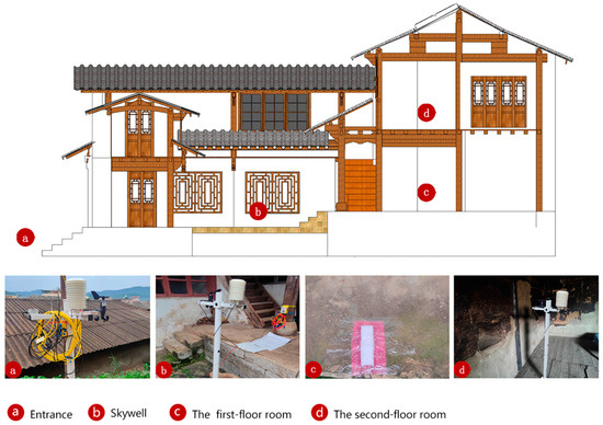 Section 3.2.3, observation points are: a (outdoor entrance), b (courtyard center), c (first-floor room), d (second-floor room).