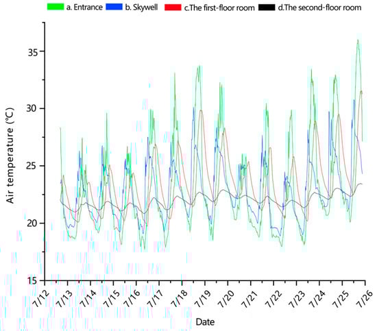 Table 10, the air velocity in the first-floor room exhibited the slowest fluctuations, indicating a relatively high stability of the wind environment in this area. However, the temperature and humidity variations were relatively significant. Under the two different skywell ratios, the average wind speeds for the first-floor room were 0.015 m/s and 0.017 m/s, and the average humidity values were 53.95% and 52.23%, respectively.