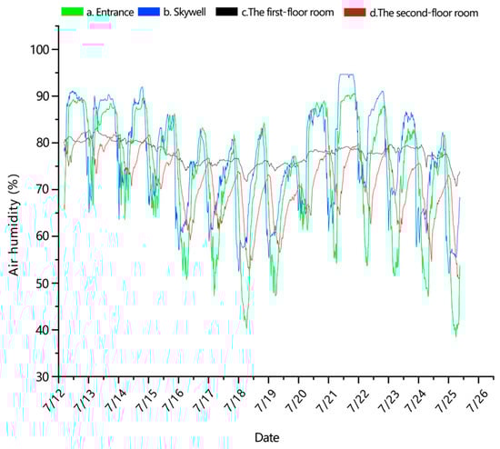 Further spatial analyses revealed a gradient of increasing air humidity from the skywell to the first-floor room and then to the second-floor room, with increases of 20–25%. Similarly, the temperature gradient showed significant spatial differentiation, with temperature differences ranging from 1.5 °C to 2.5 °C. This vertical gradient in thermal and humidity parameters highlights the substantial disparities in thermal and humidity stability, as well as climate perception, across different regions of the building. The skywell area demonstrated strong environmental fluctuations, whereas the interior spaces exhibited relatively stable thermal and humidity characteristics, with the second-floor room being the most sensitive to changes in environmental parameters. As per