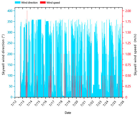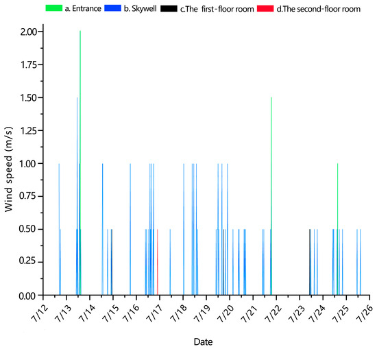 Table 11, the environmental parameters in the second-floor room showed significant differences under different skywell ratios. In Condition 1, the average wind speed in the room was 0.040 m/s (range: 0.010–0.180 m/s, with a range of 0.170 m/s), and the average humidity was 48.42% (range: 38.80–53.21%). In Condition 2, the average wind speed increased to 0.060 m/s (range: 0.004–0.018 m/s, with a range of 0.014 m/s), and the average humidity decreased to 46.47% (range: 37.60–51.15%).