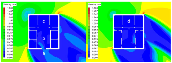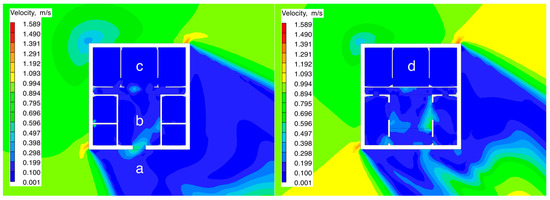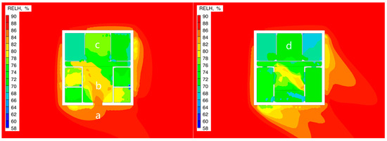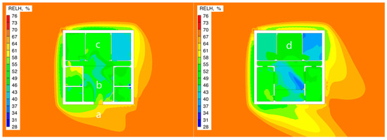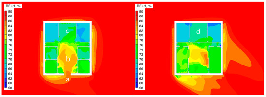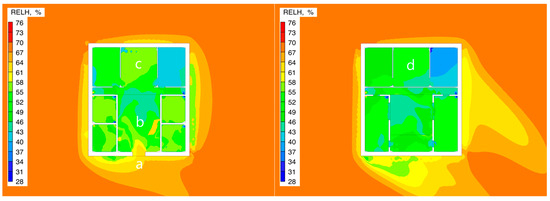Table 5, the second-floor room showed differences in environmental parameters compared to the first floor. Under both test conditions, the average wind speed of the second-floor room was 0.055 m/s (Condition 1) and 0.070 m/s (Condition 2), which represents an increase of 26.8–27.3% compared to the first-floor room. The average relative humidity was 76.56% and 75.06%, showing a decrease of 2.1–3.8% compared to the first floor. Specifically, in Condition 1, the wind speed range for the second-floor room was 0.005–0.055 m/s, and the humidity fluctuation range was 67.27–83.97%; while in Condition 2, the wind speed range expanded to 0.010–0.180 m/s, and the humidity distribution range adjusted to 65.17–82.93%.