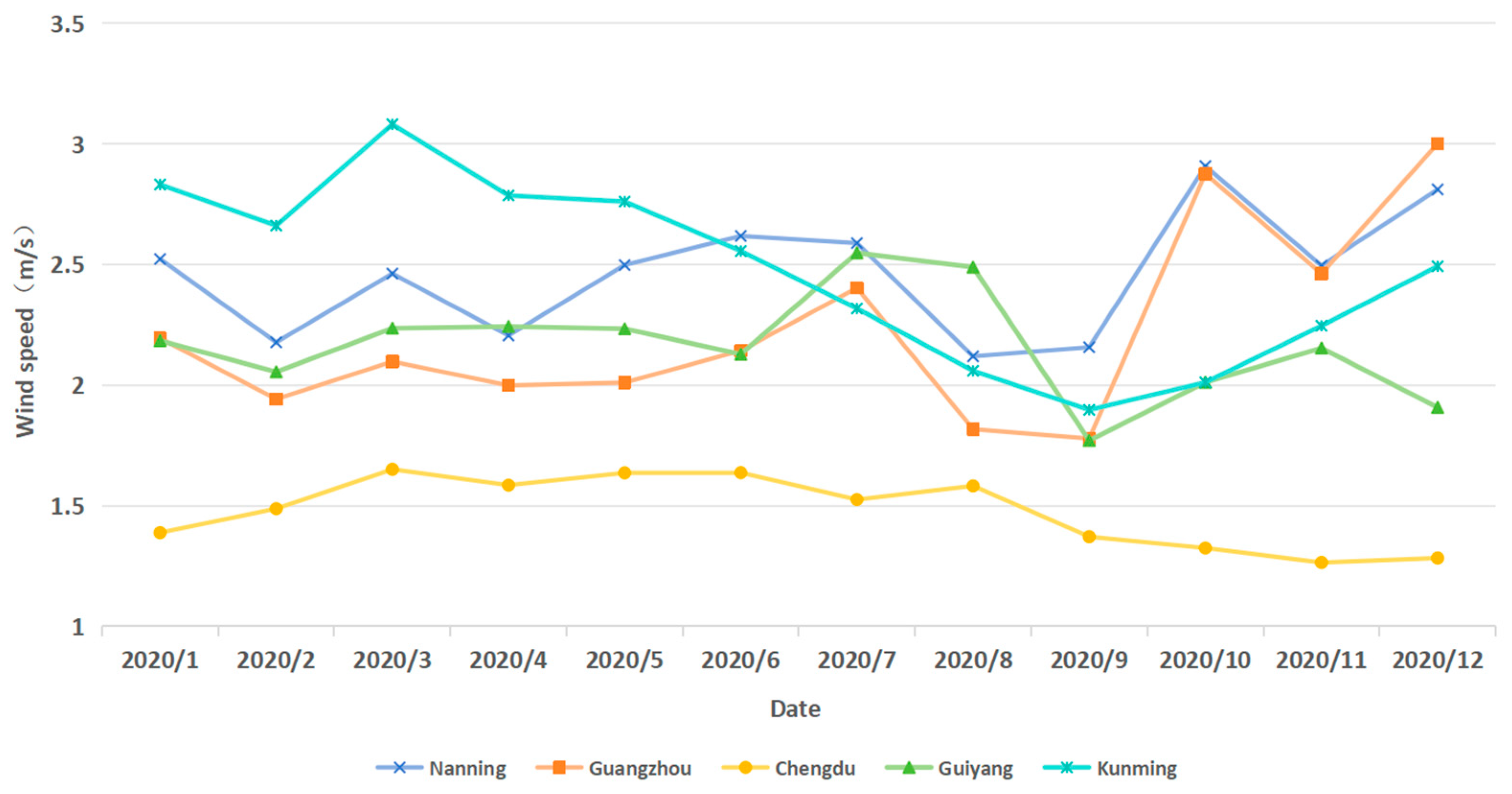 Smaller wind speeds were associated with higher relative humidity and higher temperatures.