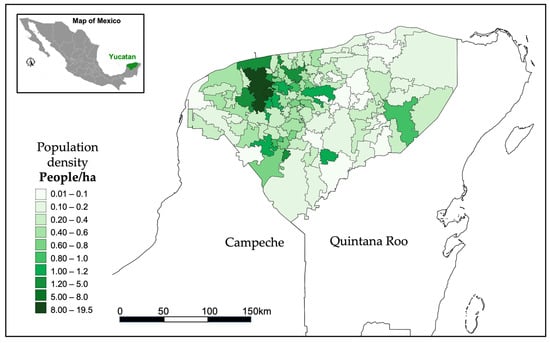 The Mexican state of Yucatan is situated in the northern region of the Yucatan Peninsula and consists of 106 municipalities with a population of 2,320,898, which accounts for 1.8% of the national populace. As per [43], the urban population of the state constitutes 89% of the total, and the rural population accounts for merely 14%. The most populous municipalities are the capital, Mérida, with 995,129 inhabitants, followed by Kanasín with 141,939, Valladolid with 85,460, and Tizimín with 80,672 inhabitants. Figure 1 displays a map illustrating the population density of the state at the municipal level. The political boundary of municipalities is depicted, with the colour scale representing population density per hectare for each municipality. The region with the highest population density is located in municipalities surrounding the city of Merida, indicated by the darkest green. The Yucatan peninsula is located around 20°30′ latitude N and 87°40′ longitude W.
