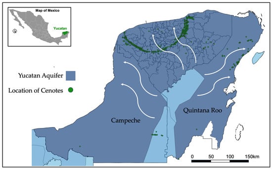 At the same time, the Yucatan aquifer is the largest reservoir of freshwater in Mexico; according to official data from the National Water Commission, it has a natural recharge of 21,813 hm3/yr with an annual availability of 2386.82 hm3/yr [48]. However, it is particularly vulnerable to contamination from agricultural practices, including pig farming. Figure 2 illustrates the geographical distribution of the Yucatan aquifer, which comprises three southern states of Mexico: Campeche, Yucatan, and Quintana Roo. Additionally, sinkholes connected with the Ring of Cenotes are indicated (marked by the green dots). The white arrows in the figure depict the main direction of the regional groundwater flow [47]. The entire state of Yucatan is encompassed by the aquifer.