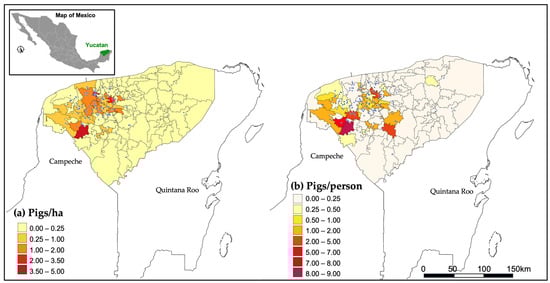 In Yucatan: (a) pigs/hectare by municipality and (b) pigs/person by municipality; blue dots in both panels show location of pig farms.