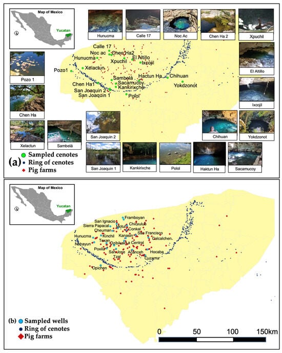 Geographical location of sampled wells (a) and cenotes (b) in Yucatan alongside pig farms (red diamonds) and cenotes belonging to the Ring of Cenotes system (darker blue dots).