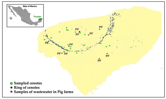 The wastewater treatment systems employed by the ten participating farms predominantly adhere to this treatment sequence, exhibiting minor variations. Certain farms incorporate processing units for the separation of suspended solids, employing mechanised methods (e.g., drums or rotating screens) or hydraulic systems (i.e., solid separation tanks). All treatment facilities analysed incorporate the four stages of treatment relevant to sampling. Wastewater samples were collected instantaneously, as wastewater is delivered in pulses. More precisely, flow occurs during the washing (flushing) of pig excreta rather than being continuous throughout the day. Each sump has sufficient storage capacity to hold the washings (flushes) produced during roughly 24 h of pig farm operation, thus functioning as a homogenisation tank. Figure 5 illustrates the geographical distribution of selected pig farms within the state of Yucatan (brown dots) alongside sampled cenotes (green dots) and cenotes belonging to the Ring of Cenotes system (blue dots).