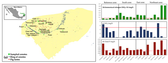The sampled cenotes are categorised according to the orientation of regional flows; six are situated in the northwest zone (Pozo1, Hunucma, Calle 17, Noc ac and Chen Ha2), three in the east zone (Xpuchil, El Altillo and Ixcojil), six in the south zone (Chen Ha1, San Joaquin 2, San Joaquin 2, Sambela and Sacamucoy), and four in a designated reference zone (Polol, Hactun ha, Chihuan, Yokdzonot), where the influence of pig farms is less significant. On the other hand, Figure 4b presents the geographical location of wells revised for water quality (light blue dots) alongside the cenotes belonging to the Ring of Cenotes system (blue dots) and the location of nearby pig farms in the region (red diamonds).