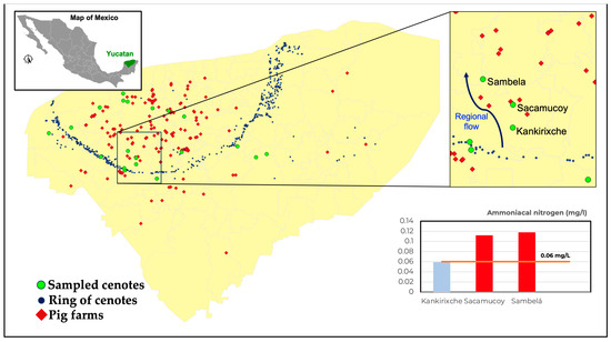 Mexico, ranking seventh among the top pig-producing countries on the planet [35], has seen a relocation of pig farming operations from the centre to southern states, where there are richer feed resources and large environmental capacity. Indeed, in the Mexican state of Yucatan, where the largest Mexican karst aquifer is located, there is a registered exponential expansion of pig farms in several municipalities. However, in several communities of the state, this intensive pig farming has raised local opposition due to the environmental concerns associated with both the number of pig farms and their waste management strategy [36,37,38]. In addition, the Yucatan aquifer, characterised by its karst geology, is particularly vulnerable to contamination from agricultural practices, including pig farming. Therefore, concerns are focused on water contamination primarily due to the management of pig manure. Indeed, recent studies in the region have indicated that the continuous disposal of untreated wastewater and the application of nitrogen-rich fertilisers contribute to elevated nitrate concentrations in groundwater, often exceeding permissible limits for human consumption [39,40,41].