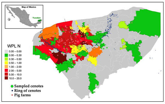 This study employs an integrated approach that involves acquiring water quality measurements from selected wells and cenotes to assess the current water quality in the state. Additionally, in collaboration with representatives from the state’s swine sector, 10 distinct industrial farms were chosen for an analysis of their water discharge. The selection of these farms was based on their possession of an official wastewater discharge permit and the implementation of operational treatment systems. They were also amenable to revising their treatment system for further modifications if required. Another criterion for selecting this set of farms was their spatial dispersion; hence, some farms were situated near areas of environmental fragility, such as the Ring of Cenotes. The exercise was completely voluntary for the swine sector seeking to achieve water sustainability in their operations. This was conducted to assess the sector’s compliance with environmental regulations. Finally, utilising the pig population record in Yucatan, this study provides an estimation of the nitrogen greywater footprint for this sector by municipality, together with the corresponding water pollution levels. This is done to establish a classification that facilitates the determination of water sustainability thresholds, which define the suitability of establishing new pig farms in each municipality within the state.
