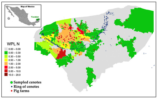 As shown in (Equation (1)), to evaluate the degree of water contamination at the municipal level, it is essential to establish a maximum nitrogen concentration threshold for the aquifer and the state’s cenotes (Cmax). Ref. [60] provided for nitrogen in rivers a Cmax value of 3.0 mg/L. In this study, the results of this proposed value and another one are more permissive (Cmax = 10 mg/L) to see the sensitivity of the results to this variable.