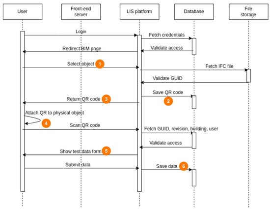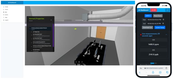 In addition to a standard API capable of updating various elements of the BIM model, the LIS platform allows users to manually submit sensor data linked to a BIM element through a web page. The researcher generates a QR code that is physically attached to the building feature subject to measurement. Each QR code encodes a link containing a text string and the IFC Global Unique IDentifier of the element, linking the physical object to its corresponding BIM element. Upon visiting the link, the LIS platform automatically authenticates the researcher, preparing data input linked to the element, which is also associated with the latest BIM revision at the time of the QR code’s creation. If a new revision becomes available later, the LIS platform will suggest submitting data for the new revision, even if the QR code refers to a previous one but only if the new revision still contains an element with the same GUID. If this is not the case, a warning is displayed to inform the user that the element may have been removed from the building, indicating significant structural changes and that a new IFC model has been uploaded to the platform where the previously linked object has been removed.