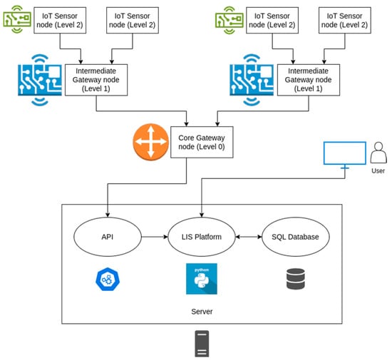 The LIS platform is a comprehensive digital solution utilized within the MULTICLIMACT EU Project as a multidomain monitoring system. It seamlessly manages, visualizes, and analyzes collected data (Figure 1 and Figure 2). It is designed to integrate with various sensor nodes deployed throughout the building (Figure 3). This platform provides a comprehensive overview of structural integrity and insights into areas needing intervention, leveraging a network of IoT (Internet of Things) devices and sensors. Wireless sensors serve as nodes for autonomous data acquisition, forming a Wireless Sensor Network, which is the foundation of the LIS network. The LIS network is delineated distinctly. The LIS platform, encompassing the LIS network, functions similarly to an IoT platform by incorporating all connected IoT devices, rather than focusing solely on the software or interfaces used for device control or sensor monitoring. The software stack runs on a virtualized Ubuntu Linux 24.04 LTS instance, which serves as the base operating system (OS) for the entire LIS platform. All other connected components are also Linux-based systems, including the server hosting the web application and the core and intermediate gateway nodes (explained below). Embedded sensors in various structures enable the creation of “smart structures”, useful in civil and mechanical engineering projects []. For building owners and high-level stakeholders, the LIS platform functions as a Smart Building Operating System. It aids in the design and management of energy-efficient, sensor-equipped structures that are safeguarded against natural threats and climatic hazards. By optimizing resources and asset management, it enhances the overall decision-making process. It is also feasible to integrate any kind of sensor as long as there is documentation on how to operate it, such as crack gauges to monitor for crack development with notifications and reports to whom the data may concern.