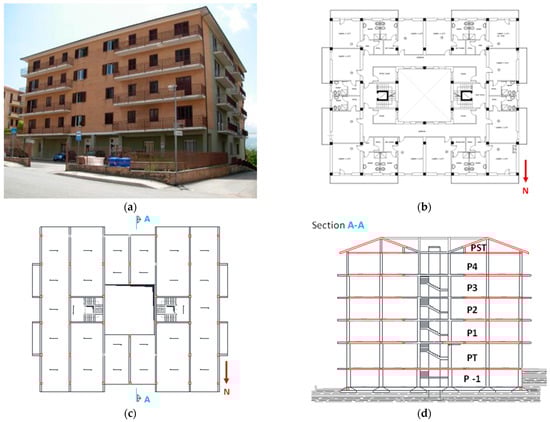 (a) Picture of Fazzini College before 2016; (b) architectural layout of the building; (c) structural layout of a floor type; (d) structural section of the building.