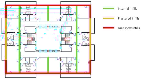 Regarding the infills, whose types and distributions are depicted in Figure 5, there are three main typologies, two for the external partitions and one for the internal ones. Concerning the external perimeter infill walls, it is possible to distinguish between the plastered infills and the “face view” ones. The first typology is realized with an internal leaf of hollow brick (s = 8 cm), a cavity of variable thickness, and an external unconnected leaf realized with thicker hollow bricks (s = 12.5 cm). The “face view” infill is composed of an internal leaf of hollow brick (s = 8 cm), a cavity of variable thickness, and an external unconnected leaf realized with semi-solid bricks (s = 12.5 cm). Finally, the internal infills are realized with a double lining in hollow brick type tile (s = 6 cm), separated by a cavity of variable thickness among the different elevations.