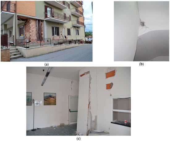 Pictures of the seismic damage suffered by Fazzini College in 2016: (a) damage to external infills; (b) damage to the stairs of the lower elevations; (c) damage to internal partitions.