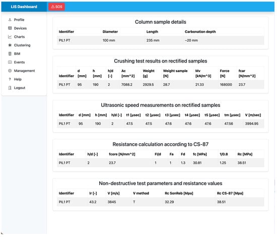 All the data resulting from the tests were entered into the digital twin on the LIS platform to monitor the building over time. As an example, Figure 7 shows a screenshot taken from the platform concerning column 1.