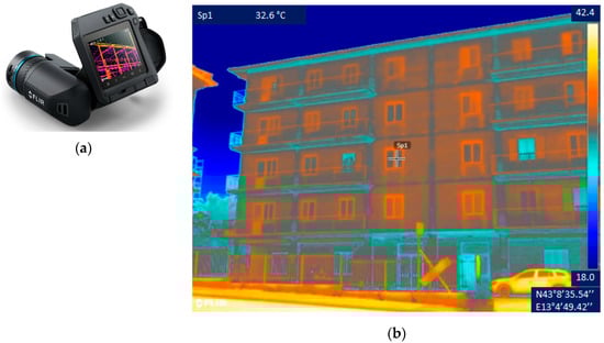 Thermographic analyses: (a) FLIR T560® thermal camera; (b) example of the thermal processed image of the main façade.