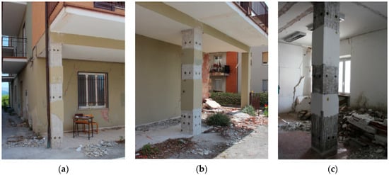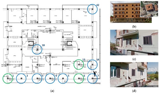 Figure 9a shows the plan of the ground level, where the columns chosen to be tested are highlighted by a circle (the green line indicates both sonic and ultrasonic tests, whereas the blue line indicates sonic tests only). Most of them have all four sides free from infill walls, and, thus, it is possible to perform direct tests. In the case of partially confined columns with adjacent sides uncovered only indirect tests are feasible. In the same figure some pictures of the building, documenting the external post-earthquake crack pattern, can be seen (Figure 9b–d).