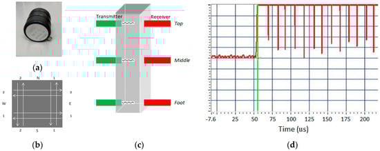 (a) IMG5200CSD® ultrasonic probe; (b) scheme of the ultrasonic paths; (c) scheme of direct measurement; (d) example of the sampling of the ultrasonic signal.
