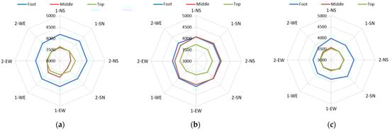 In Figure 12, the ultrasonic mean speeds (m/s), for each path at the three locations (the Foot, the Middle span, and the Top) of the three tested columns, are summarized. The quite regular shape of the octagons suggests that, in the cross-sections, the mechanical properties are almost independent from the point of application of the signal and the direction of the test. On the other hand, there is a certain longitudinal variation with the lowest values of velocities recorded at the Top.