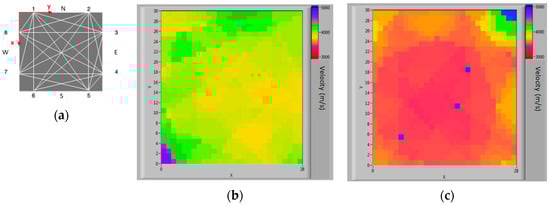 (a) Scheme of tomography paths. Column 13 speed distributions: (b) at the Foot; (c) at the Middle span.