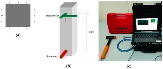 To widen the knowledge of the structure, the eleven columns circled in Figure 9 have undergone sonic tests. The sound waves were generated by placing a receiving piezoelectric accelerator and impacting the column using an instrumented hammer on the same face at two points (1 and 2) for each side (N, S, E, and W), as shown schematically in Figure 14a,b. The data acquisition and processing were handled with the IMG5200CSD® (IMG Ultrasuoni srl, Mandello Lario, Lecco, Italy) device (Figure 14c), which is a digital low-frequency device for the control of inhomogeneous materials, to which the hammer instrumented with the accelerometer sensor is also connected.
