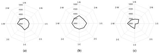 In Figure 15, for the same columns tested through the ultrasonic method, the mean speeds (m/s) obtained through sonic tests, for each point (1 and 2) and each side (N, S, E, and W), are summarized. The octagons appear to be irregular and close to the ones obtained at the Top location through ultrasonic tests.
