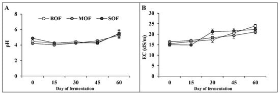 Change in pH (A) and EC (B) in liquid organic fertilizers during 60 days of fermentation. (BOF, brassica-based liquid fertilizer; MOF, mushroom-based liquid fertilizer; SOF, soybean-based liquid fertilizer).