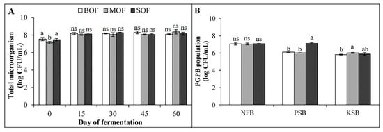 Population of total microorganism (A) during 60 days of fermentation and plant growth promoting bacteria (B) in the finished liquid organic fertilizers. Each bar expressed mean ± SD, and means with different letters were significantly different at p < 0.05 (BOF, brassica-based liquid fertilizer; MOF, mushroom-based liquid fertilizer; SOF, soybean-based liquid fertilizer; NFB, nitrogen-fixing bacteria; PSB, phosphorus solubilizing bacteria; KSB, potassium solubilizing bacteria; ns, non-significant).