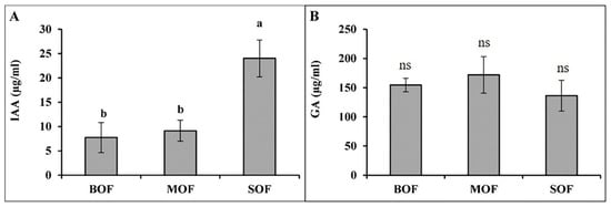 The three LOFs contained a considerable amount of plant hormones, such as IAA and GA (Figure 3). IAA produced in SOF (24 µg/mL) was significantly higher than that in BOF (9 µg/mL) and MOF (13 µg/mL). Meanwhile, the amount of GA in three LOFs was not significantly different (ranging from 136 to 171 µg/mL). The ANOVA table showing the level of significant differences in IAA and GA content among the three LOFs is shown in Supplementary Table S4.