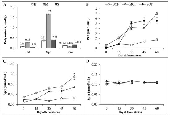 Polyamine contents in fresh starting plant materials (A) and concentration of Put (B), Spd (C), and Spm (D) in the three liquid fertilizers during fermentation (B, brassica vegetables; M, mushrooms; S, soaked soybean seeds; BOF, brassica-based liquid fertilizer; MOF, mushroom-based liquid fertilizer; SOF, soybean-based liquid fertilizer; Put, putrescine; Spd, spermidine; Spm, spermine).