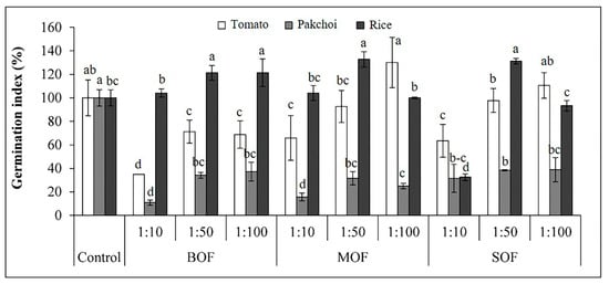 The GI of all seedlings treated with diluted solutions of LOFs was presented in Figure 5. The GI of tomato was lower than 80% at a high concentration of LOFs (1:10 dilution). Low GI was also found in other concentrations of BOF. Meanwhile, the GI of tomato seeds treated by MOF and SOF (1:50 and 1:100) were higher than 80%. The GI of pakchoi was extremely low, less than 40%, at all dilution ratios of all LOFs. Oppositely, the GI of rice in all dilutions of all LOFs was higher than 80%, except for SOF at 1:10. The ANOVA table showing level of significance differences for GI of tomato, pakchoi and rice seeds treated with the three LOFs is shown in Supplementary Table S6.
