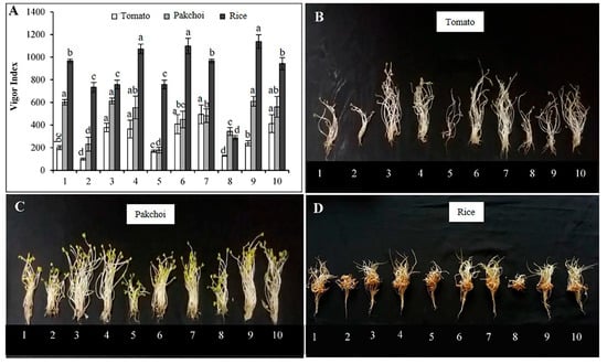 Vigor index (A) and seedlings of tomato (B), pakchoi (C) and rice (D) at 7 days after seed germination in the presence of different dilutions of liquid organic fertilizers: (1) distilled water; (2, 3, 4) 1:10, 1:50 and 1:100 dilution of BOF; (5, 6, 7) 1:10, 1:50 and 1:100 dilution of MOF; (8, 9, 10) 1:10, 1:50 and 1:100 dilution of SOF. Each bar in (A) expressed mean ± SD, and means with different letters were significantly different at p < 0.05.