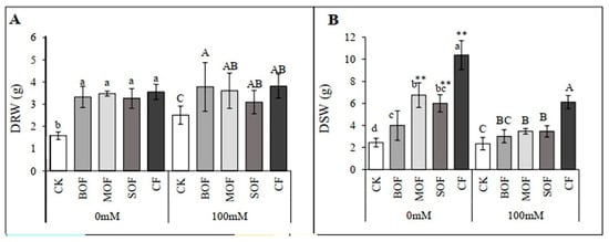 Dried root weight (DRW) (A) and dried shoot weight (DSW) (B) of rice plants treated with water (0 mM) and salt stress (100 mM NaCl) after 14 days. For each group, the bar expressed mean ± SD, and means with different letters were significantly different at p < 0.05. The significant difference (p < 0.01) between means of the non-stressed (0 mM) and salt-stressed (100 mM NaCl) receiving the same fertilizer was indicated by ** (CK, no fertilizer; BOF, brassica-based liquid fertilizer; MOF, mushroom-based liquid fertilizer; SOF, soybean-based liquid fertilizer; CF, chemical fertilizer).