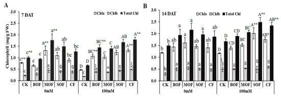 Chlorophyll content in the leaf of rice plants after 7 days (A) and 14 days (B) treatment with water (0 mM) and salt stress (100 mM NaCl). For each group, the bar expressed mean ± SD and means with different letters were significantly different at p < 0.05. The significant difference (p < 0.05 or p < 0.01) among the means of the non-stressed (0 mM) and salt-stressed (100 mM NaCl) receiving the same fertilizer was indicated by * or ** (CK, no fertilizer; BOF, brassica-based liquid fertilizer; MOF, mushroom-based liquid fertilizer; SOF, soybean-based liquid fertilizer; CF, chemical fertilizer; ns, non-significant).