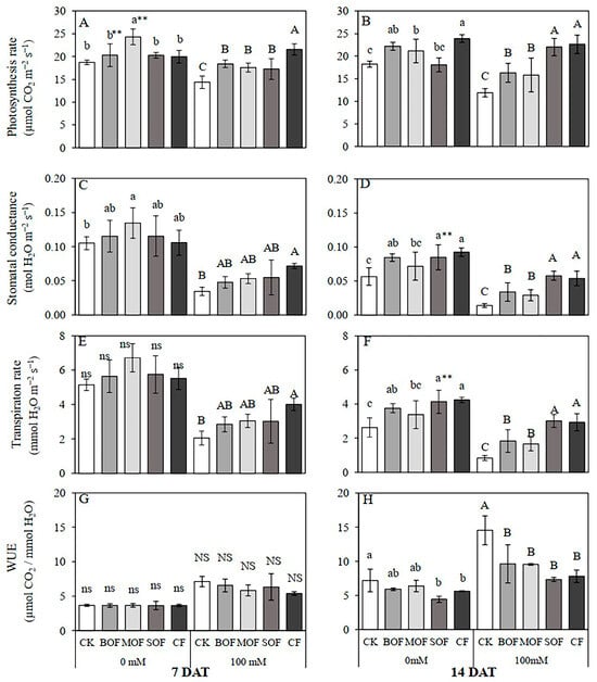 Effect of liquid organic fertilizers on net photosynthesis rate: (A,B) stomatal conductance (C,D), transpiration rate, and (E,F) water use efficiency (WUE) (G,H) of rice plants after 7 days (A,C,E,G) and 14 days (B,D,F,H) treatment with water (0 mM) and salt stress (100 mM NaCl). For each group, the bar expressed mean ± SD, and means with different letters were significantly different at p < 0.05. The significant difference (p < 0.01) between means of the non-stressed (0 mM) and salt-stressed (100 mM NaCl) receiving the same fertilizer was indicated by ** (CK, no fertilizer; BOF, brassica-based liquid fertilizer; MOF, mushroom-based liquid fertilizer; SOF, soybean-based liquid fertilizer; CF, chemical fertilizer; ns/NS, non-significant).