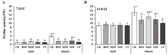 Proline content in the leaf of rice plants after 7 days (A) and 14 days (B) treatment with water (0 mM) and salt stress (100 mM NaCl). For each group, the bar expressed mean ± SD, and means with different letters were significantly different at p < 0.05. The significant difference (p < 0.01) between means of the non-stressed (0 mM) and salt-stressed (100 mM NaCl) receiving the same fertilizer was indicated by ** (CK, no fertilizer; BOF, brassica-based liquid fertilizer; MOF, mushroom-based liquid fertilizer; SOF, soybean-based liquid fertilizer; CF, chemical fertilizer; ns, non-significant).