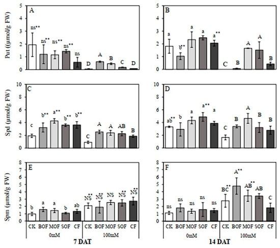 Effect of liquid organic fertilizers on the endogenous contents of Put (A,B), Spd (C,D), and Spm (E,F) in the leaf of rice after 7 days (A,C,E) and 14 days (B,D,F) treatment with water (0 mM) and salt stress (100 mM NaCl). For each group, the bar expressed mean ± SD, and means with different letters were significantly different at p < 0.05. The significant difference (p < 0.01) between means of the non-stressed (0 mM) and salt-stressed (100 mM NaCl) receiving the same fertilizer was indicated by ** (CK, no fertilizer; BOF, brassica-based liquid fertilizer; MOF, mushroom-based liquid fertilizer; SOF, soybean-based liquid fertilizer; CF, chemical fertilizer; Put, putrescine; Spd, spermidine; Spm, spermine; ns/NS, non-significant).
