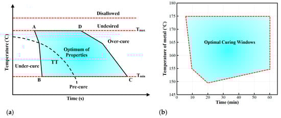 Schematic representation of (a) the paint cure window (PCW) operational criteria for an automotive oven, and (b) optimal curing operational conditions for the primer coat layer.