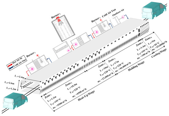Schematic representation of the computational domain for a fully configured multi-zoned oven including heat-up, holding, and cooling stages.