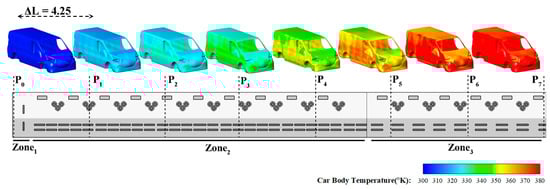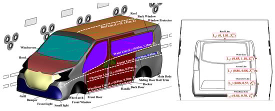 The supplied hot-air temperatures, which are blown from the wall-mounted nozzles and panels in different zones, range from 190 °C to 220 °C, and the velocities of turbulent flow range from ≈3.0 m/s to 21 m/s (see Table 1). Relatively cooler fresh air is replenished from both ends of the oven, in addition to the mentioned circuits, to compensate for the lost air. The return air ducts located at the top are evacuated of an equivalent airflow volume in a crosswise direction relative to the axial direction zone (see Figure 3), and the outlets are defined as pressure boundaries. Figure 4 illustrates the Citroën Berlingo car body surface, highlighting key aesthetic lines—including wheelbase, character, accent, waist, and roof lines—at heights of 0.3 m, 0.57 m, 0.88 m, 1.18 m, and 1.81 m from the ground. These lines are used for result analysis.