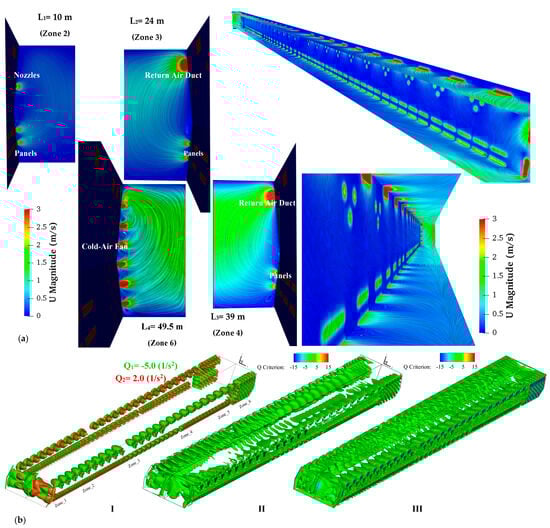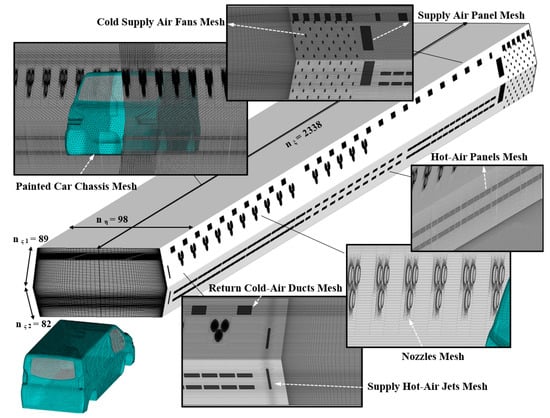 The computing grid quality directly influences the accuracy of the numerical results. A comprehensive representation of the computational grid for a considered full-length curing oven with multiple close-up views is depicted in Figure 7. Despite considerable complexities, all zones of the computational domain, solid and fluid regions inside the oven, are constructed using fully structured quadrilateral grids, except for cases including the traversing box of the car body, comprising non-uniform tetrahedral cells due to the complex geometry.