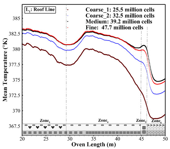 The computational domain is decomposed into fifty-four sub-sections over the six zones, with their components, to achieve more control on the grid’s ratio and size, especially in regions with higher flow gradients, i.e., near the nozzles, panels, ducts, and fans. The wall grid size near boundaries significantly affects the conjugate heat transfer (CHT) predictions, as in Reynold’s analogy. To perform a mesh independence analysis, four grids with various resolutions and volumetric mesh counts of the coarse_1 (≈25.3 million cells), coarse_2 (≈32.1 million cells), medium (≈39.2 million cells), and fine (≈47.6 million cells) were produced with suitable values in all grids to adequately capture the boundary layers. Based on the grid convergence evaluation (see Figure 8) for the mean temperature distribution along the roof line (L1) of the considered four different grid sizes in zones 3–6, we concluded that modeling using the medium mesh with an overall account of ≈39.2 million cells is appropriate. It is clear that increasing the surface cells makes the difference between the mean temperature values negligible. For this grid, the number of cells used in the streamwise (nξ), vertical (nη), and spanwise (nς) directions are around 2177, 156, and 92, respectively (see Figure 7). At the boundaries of nozzles, panels, and ducts located on the walls of the oven, the mesh comprises a prism layer with a height of roughly 2.5 × 10−3 m (medium mesh). The size of the grid progressively increases with a higher ratio outward of the mentioned boundaries, where the flow variations are comparably reduced. The typical mean values of the expansion factors are approximately 1.045 in the direction normal to the oven’s wall components. For medium mesh, by considering this size ratio, the minimum and maximum values of mesh size are approximately 0.25 cm and 3.75 cm, respectively. Despite the oven’s five hundred thirty-three components (see Table 1), the mesh size near the wall and features specified and tweaked, a mesh with suitable values of was constructed.