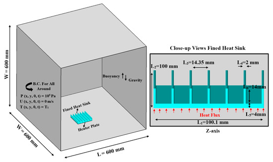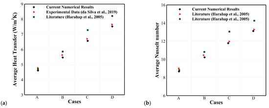 The heat power conditions for four considered cases are described in Table 4. T∞ and Thot are indicated as the mean atmospheric and central fin base temperatures, respectively. In Figure 11, the average heat transfer () and Nusselt number () values are validated with the experimental data of da Silva et al. [59] and the analytical results of Harahap and Rudianto [60]. , , and are the fluid thermal conductivity, heat transfer flux among the fluid and heatsink, and half of the fin width ().