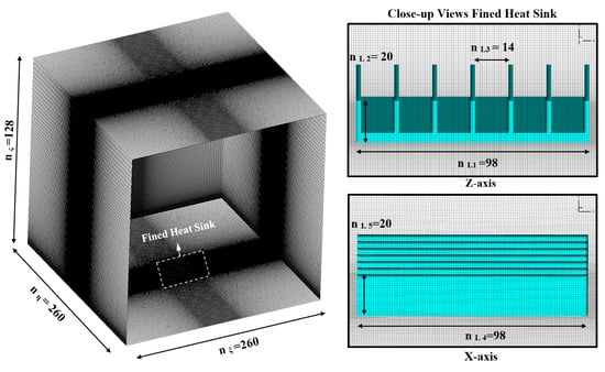 The accuracy of the CHT code and numerical method was evaluated using a transient heat convection–conduction model of a 3D heat sink (see Figure 9). This problem closely resembles the automotive curing oven in terms of fluid–solid interaction (FSI) flow physics and depicts the computational domain’s dimensions and boundary conditions. The squared domain has a 600 mm side length, around 43 times the heat sink’s height, and all-around surfaces are subject to atmospheric pressure conditions. The heat sink’s base is heated to a constant temperature Thot (K). The fully structured grid generated in this instance comprises ≈ 10.3 million cells after evaluating various grid sizes (see Figure 10). All grid sizes in various directions of the domain and over the heat sink surface are reported in Figure 10.