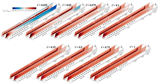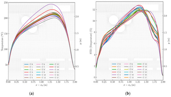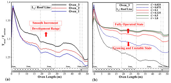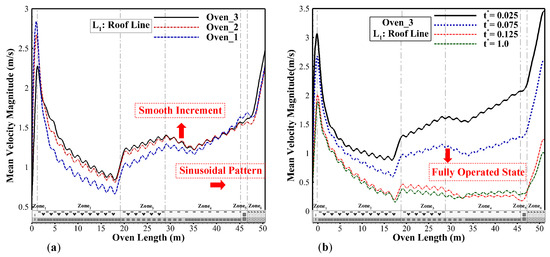 The main objective is to analyze the mean air temperature along the oven length, together with precise temperature distribution obtained on the solid car body surface. As mentioned earlier, the accurate LES turbulence model is used in the current simulation to achieve this goal. Figure 12 and Figure 13 show the complexity of the hot-air flow field pattern and the mean temperature distribution in the center and side section planes along the full oven length. Nine consecutive frames of the temporal variation in the mean air temperature during one complete cycle, up to reaching the fully operational condition after the startup of the base oven (Oven_1), are presented in Figure 12. Analyzing these frames enables us to comprehend the complex initial hot-air flow interference in the oven space, which is difficult in practice. In zones 1 and 2, during the heat-up stage, hot-air feeding is coupled with convection and circulation thermal heat transfer. Weaker hot-air operation and lower average temperatures in the third zone of the heat-up stage are evident due to low panel density. The inappropriate diffusion directions of the hot-air injectors during heating (Figure 13a) highlight the need for proposing an optimal oven design to achieve a homogenized temperature distribution. As apparent in the case of Oven_1, due to the slight hot-air gradient and density in the areas where car bodies are traversing, less thermal power is absorbed via convection between the solid car surface and the oven gases. To address the issue of weak heat diffusion and dispersion in the upper-wall and lower-ground regions where the roofline and wheelbase line are located, especially in zones 3 and 4, the Oven_3 case is introduced. By moderately redirecting the hot-air injectors and developing their flow share (see Table 2), the distribution was optimized. The temperature contour in the Oven_3 case, across all zones, shows a more uniform distribution, essentially devoid of a severe jump, as well as a gradual longitudinal gradient (Figure 13c). It leads to enhancing energy efficiency and reduces sustainable energy consumption. In the case of Oven_2, the improvement occurs, but not precisely at the location that the bodies are traversing, as in Oven_3.
