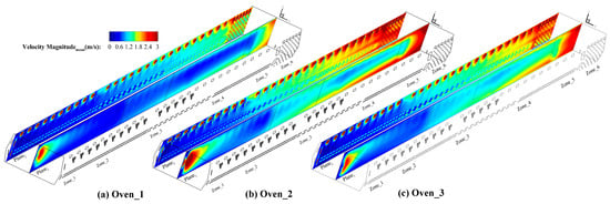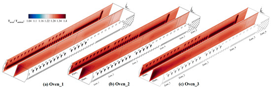 A summary of the steps involved in designing the modified version of the oven is presented here; see Table 2. These corrections are examined for zones 1 to 3 and 6, where the diffusion of the heated air occurs through two series of injectors positioned on both the oven’s upper and lower walls. For modification in the case of Oven_3, the share of the flow rate is manipulated by the equal volume of hot air produced by means of burners 1 to 3. Around 14.7%, 4.3%, 4.3%, and 10% of the flow rated is subtracted from the upper channels and added to the lower ones in zones 1, 2, 3, and 6, respectively, compared to the base oven (Oven_1). These manipulations are intended to improve convection while maintaining the exact amount of generated airflow rate, which is derived from the burners. In the Oven_2 case, this process is implemented to a greater extent compared to the Oven_1 case (base oven) with values of 25%, 15%, 10%, and 10% for zones 1, 2, 3, and 6, respectively.