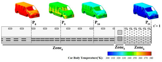 A full-length automotive oven, in combination with the traversing BiW, is modeled in the present CFD computation. The oven’s external walls are specified as a convective boundary condition to account for heat loss to the ambient air. We assumed ALSI302 steel as the constructive material of the car body surface with properties of , , , and . The schematic structure of the applied curing oven, including all zones in the heat-up, holding, and cooling stages, is provided in Figure 2. The oven configuration with 53 m total length has six connected zones, three for the heating up, two for the holding, and one for the cooling. The vehicle’s traversal time for passing through the full oven’s length is ttt = 31 min, which is used as the reference value for defining the dimensionless time (t* = t/ttt) in this work. The current structure is based on an existing automotive oven, and the operating parameters in all zones are validated using actual conditions for the base oven case.