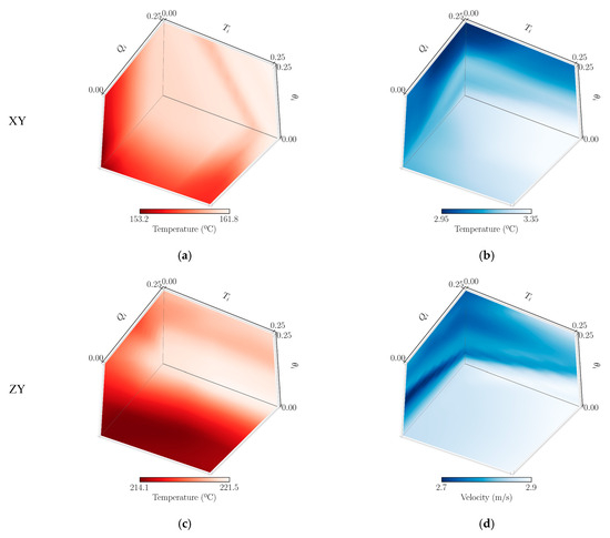 where , , and represent the normal direction to the wall and fluid and solid thermal conductivity, respectively. Here, a Neumann–Neumann decomposition approach is applied among various available thermal field coupling techniques [48], guaranteeing the balance of and equations under the prescribed tolerance.